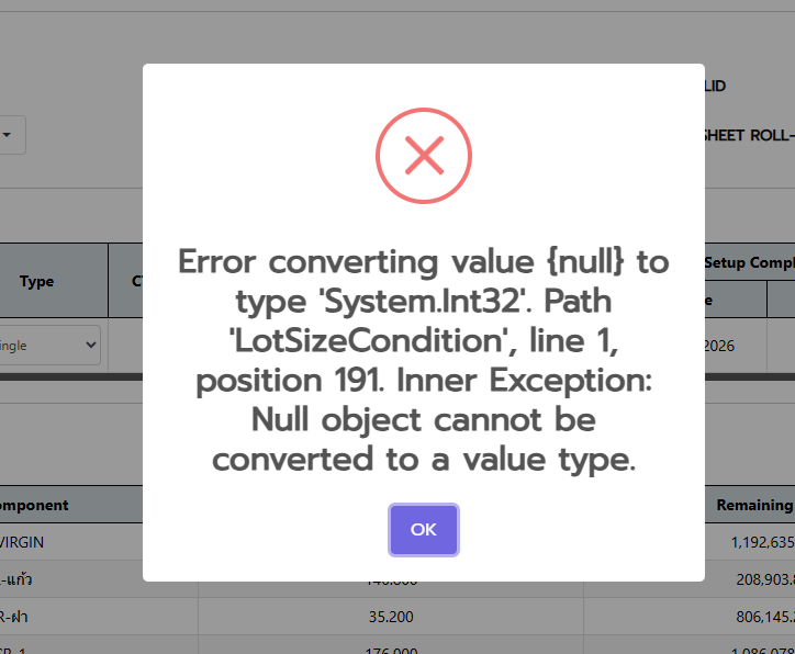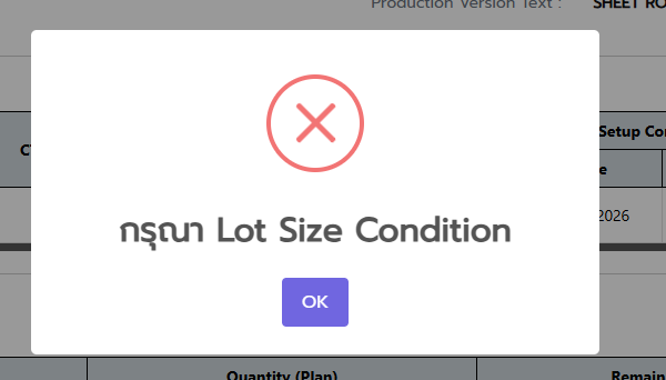 openเมื่อลืมกรอก Lot Size Condition ระบบแสดง pop up 2 อันแบบในรูป